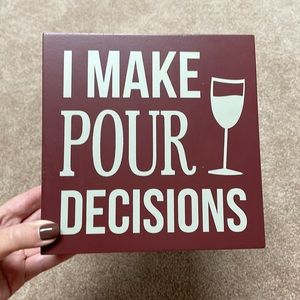 Add a touch of humor to your home with this red decorative sign. Perfect for wine lovers, it features a playful quote that will bring a smile to your face.
