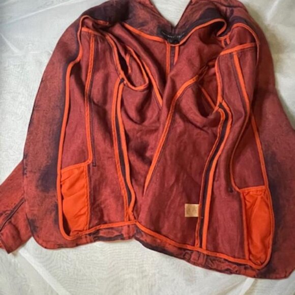 One of a kind Theyskens' Theory Denim Jacket in a vivid red hue complemented by stone wash accents. This sophisticated, yet classic Jacket is perfect for someone who appreciates a blend of simplicity and elegance.