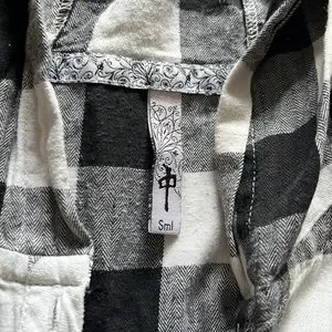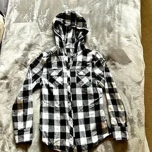 EUC Red Dragon long sleeve button up with large hood. pleated back and ruffle bum detail. Takes your regular old plaid button up and gives it that girly edge while still keeping it casual. Love this piece but unfortunately too small.