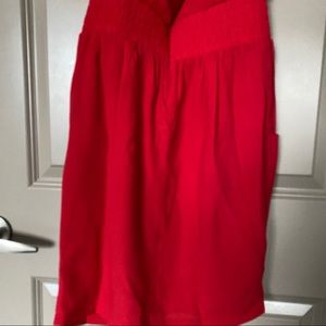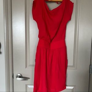 A red dress with loose fit at the top and ruched around the waistline for a better fitting. It also has two side pockets and a zipper at the back.