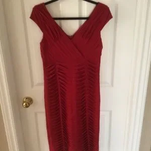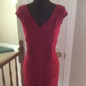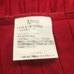 Wear red for Valentine’s Day or for February heart month events or for any other occasion that may call for an eye-catching red dress. This lovely comfortable Canadian made dress, worn only once for a wedding, is machine washable with a fibre content comprised of 95% polyester and 5% spandex.