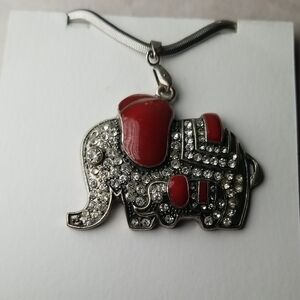 a 1 by 2 inch metal elephant pendant in red enamel with rhinestones