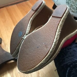 Gorgeous high platform peep-toe ankle strap shoes. Red colour. Fabric upper material. Size 9. Good condition, only wore a few times. Some strings are a bit loose on ankle straps (not noticeable when wearing, see pic). Woven detailing. Smoke free home.