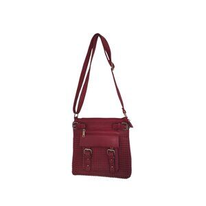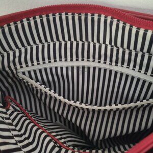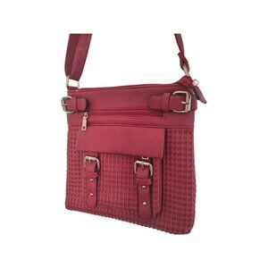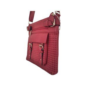 Add a pop of color to your wardrobe with this stylish red faux leather shoulder bag. This versatile bag is perfect for both casual outings and more formal events. The front features elegant buckle details and a zippered pocket, while the interior is lined with chic black and white stripes. The bag offers ample storage with its main compartment and additional pockets, making it as functional as it is fashionable.