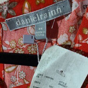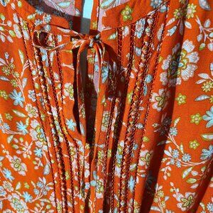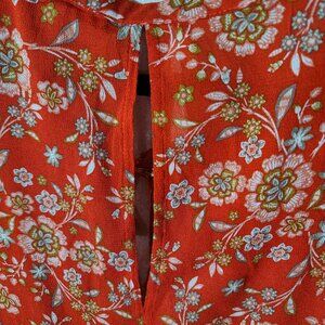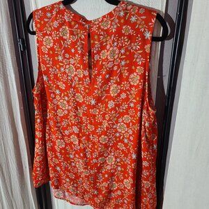 Red floral sleeveless blouse, new with tags. Pleated/lace detail and tie at front, peekaboo slit on back, light-weight and cool.