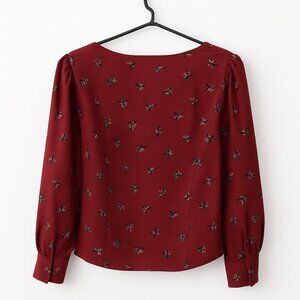Red Floral Button-Front Blouse - Square Neck, Long Sleeves