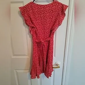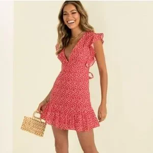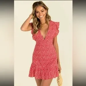 Chic and stylish red floral dress with elegant ruffle details. Perfect for any occasion.