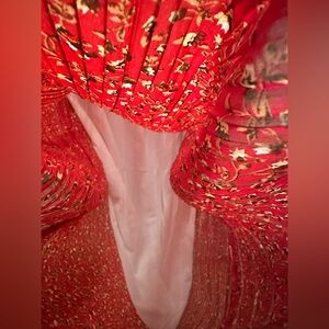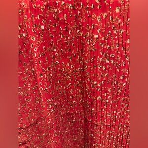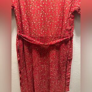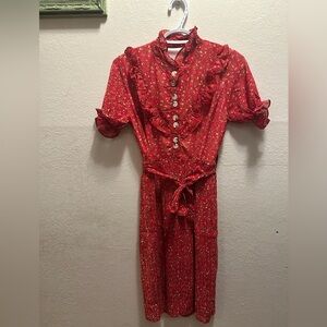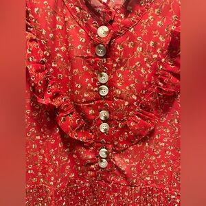 Charming red dress with floral pattern and ruffle details. Features button-up front.