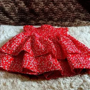 Charming red skirt with floral pattern and ruffles. Perfect for a playful look.