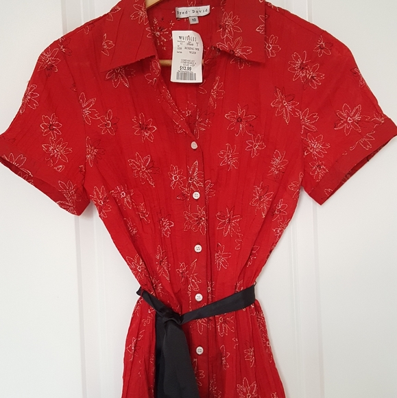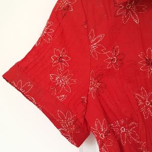 Red button up blouse with black and white flower detailing. Collar and waist string