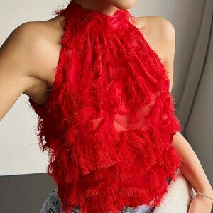 Red Fluffy Fringes Halter Neck Top Blouse