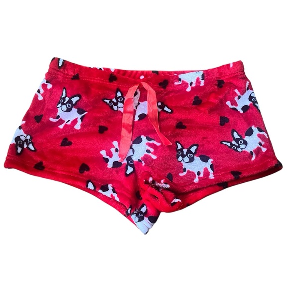 Cute red fleece shorts with a playful French Bulldog or Boston Terrier and heart print. Perfect for lounging.