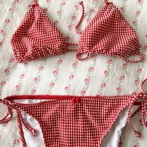 Stylish red gingham bikini set. Features a halter top and tie-side bottoms. Top is size M and bottoms are XL (I sized up for more coverage and a higher rise)