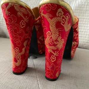 Red & Gold embroidered Satin vintage platform high heeled "clog"