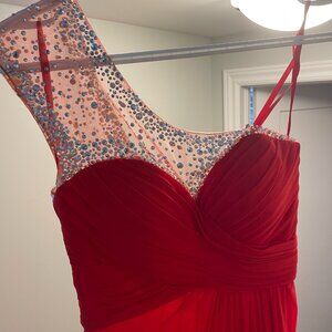 Full Length One Shoulder Red Gown - Grad Dress Size 4. Diamanté detailing.