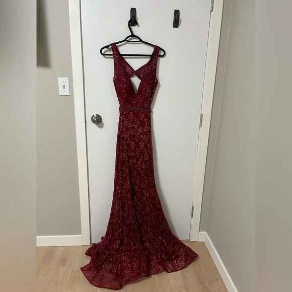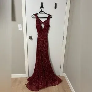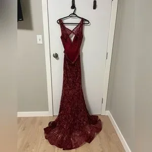 The dress is floor length with a beautiful and manageable small train. It’s red with sequence that photographs beautifully. Only worn twice for my graduation in 2021 and has been dry cleaned since. Condition is used but good as new!