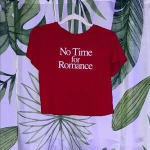 Stylish red graphic tee with 'No Time for Romance' print. Perfect for casual outings.