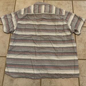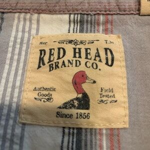 Get ready for summer with this stylish and comfortable men's short-sleeve button-down shirt from Red Head Brand Co. The shirt features a classic stripe pattern in gray, white, and a subtle reddish-pink. Made from a lightweight, breathable fabric, it's perfect for warm weather. This shirt is a size 3XL and was made in Vietnam. It's in excellent condition and ready to be a staple in your casual wardrobe.