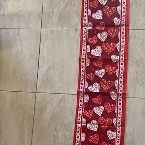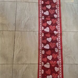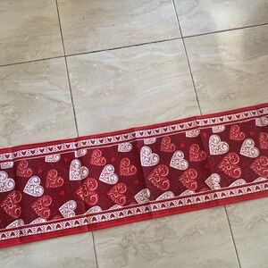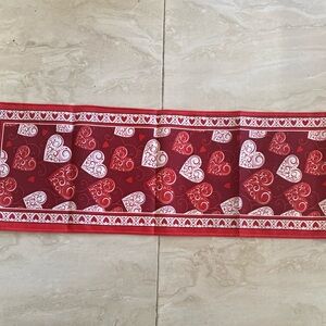 Elegant table runner with a red and white heart pattern. Perfect for adding a romantic touch to your decor.. 72”Lx 13”W