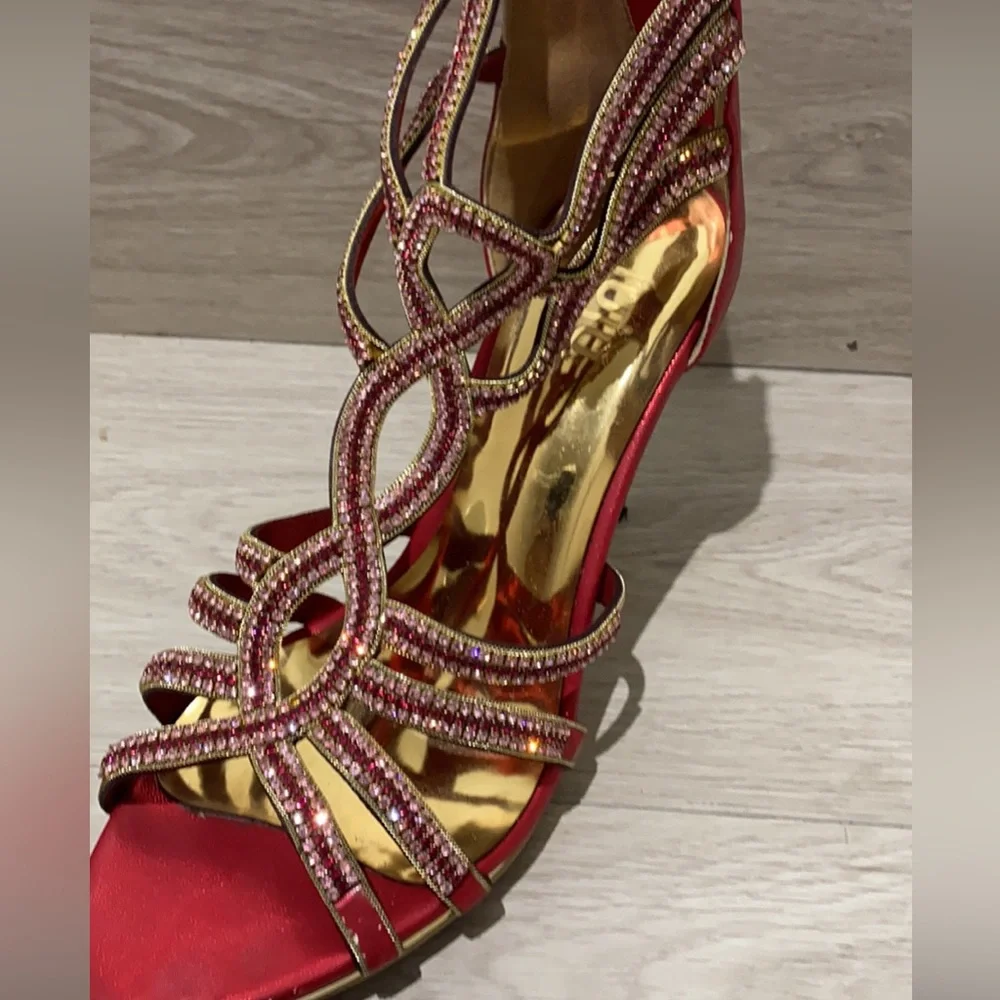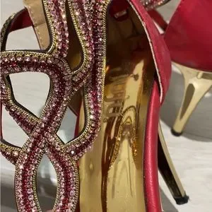 Worn once for my wedding day, very comfortable, 1.5inch heel. Bright red in colour with gold accent and pink beads, rubber sole, good for grip. Zipper on back of the heel.