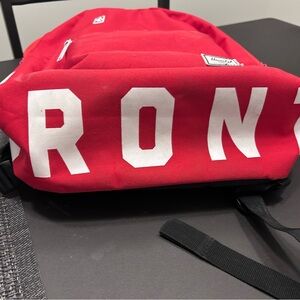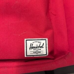 Stylish red backpack featuring Raptors logo. Herschel branding adds a touch of quality.