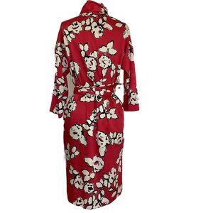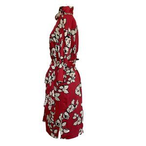 Oversized, cherry red high neck shift dress with cream/black floral print has neck and shoulder opening with square buttons and loop closure, 3/4 length sleeves and sash.