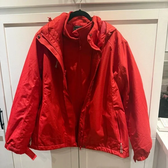 Stylish red hooded jacket with zip closure. Perfect for casual wear. Womens 3 In 1 Jacket is perfect for outdoor adventuring. It has a waterproof and breathable outer jacket made with IsoDry technology to keep you protected in the rain. It has zipped pockets to safely carry your possessions and adjustable cuffs and hood for increased protection. The inner softshell jacket is water-resistant and can be zipped out and worn on its own. This versatile jacket is perfect for daily walks and will have you prepared, whatever the weather.
