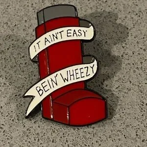 Fun enamel pin shaped like a red inhaler with a humorous message. Perfect for adding a playful touch to your outfit.