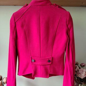 Beautiful structured jacket from BCBG in an eye-catching red. Very structured, almost a military style fit. No tags, but has only been worn once! I've gone back to school to do a PhD, so unfortunately don't need my chic/formal/tailored clothes anymore.