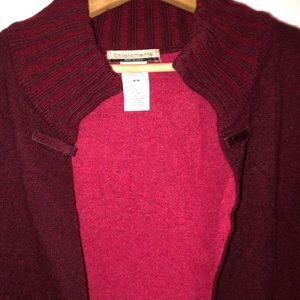 Coatigan has ribbed 3/4 sleeves and ribbed collar. Front patch pockets with clasp closure at neck. Fabric is wool/nylon/elastane blend and does have some stretch. Marked as medium (could easily fit L too). Label is ‘Chiaramente’ and EUC.