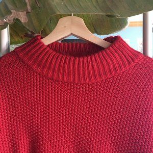 Super adorable and comfortable red knit sweater. It is a beautiful bright red and the collar is super trendy and modest. No damage whatsoever.