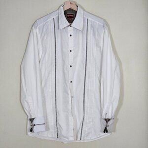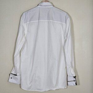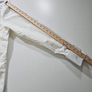NOTE: cream/ivory color of shirt is showing some slight yellowing under certain angle - see photos. Also, some buttons are missing 'pearl' top - one button on a front and one on right sleeve - see photos. Due to metal rim of buttons touchin material, there are couple of tiny rust colored spots - see photo.