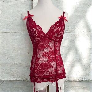 Red Lace Lingerie Top with Bows and lace up back M whimsygoth coquette