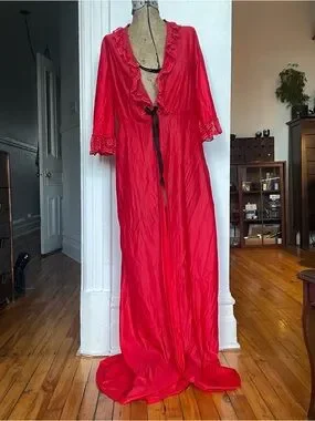 Red Lace-Trim Long Robe with button