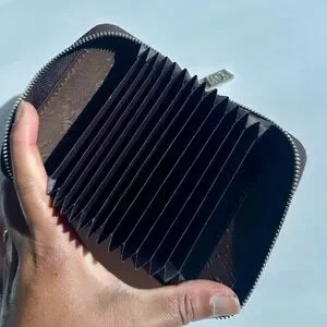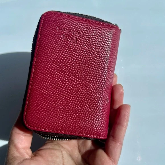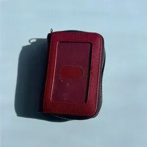 Sleek and stylish red leather card wallet with a secure zipper closure. Perfect for organizing all your cards in one place.