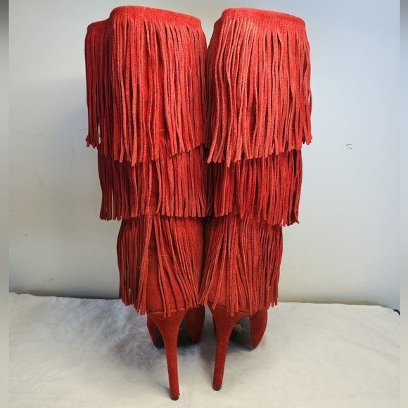 Ultra feminine & Sexy Platform Stiletto High Heel Red Suede Leather Boots with 3 layers of fringe tassles, 'Burlesque' by Mojo Moxy.