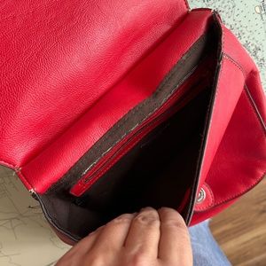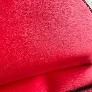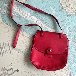 Adorable red vegan leather purse made by Denver Hayes. Strap has some loose stitching, otherwise great condition! Measures 9.5" wide, 8.5" tall, 2.5" deep.