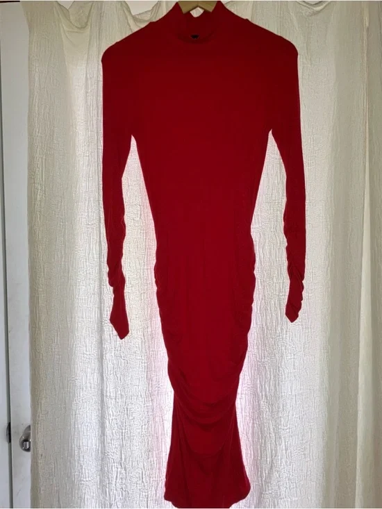 Red Long-Sleeve Ruched Bodycon Dress