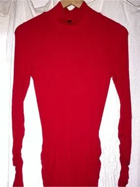 Elegant red long-sleeve ruched maxi dress with a high neckline. Stretchy fabric flatters the silhouette and provides comfortable wear. Ruched detailing adds texture and a refined finish. Versatile piece for evening events or special occasions.