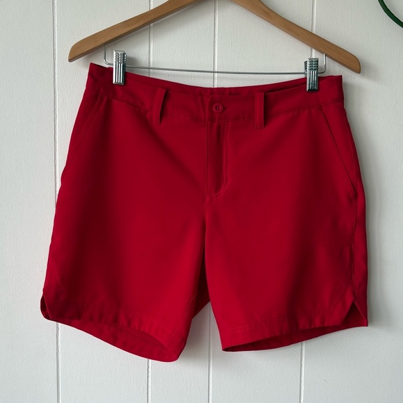 These vibrant red shorts feature a sleek flat front design, perfect for a polished look. Crafted from a crisp, structured fabric, they offer a smooth, wrinkle-resistant finish ideal for business casual settings. The mid-thigh length adds a modern touch to your wardrobe.