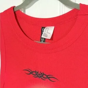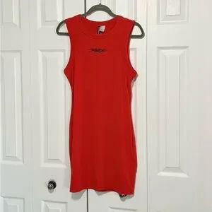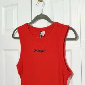 Red mini dress super comfortable stretchy material. Black design on front. Size medium. 18” pit to pit. 32.5” length.