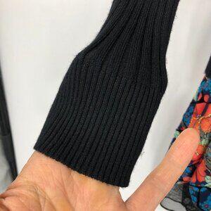 Half button up style shirt with a built in cardigan. The shirt portion is red multicolor floral and the cardigan portion is black.