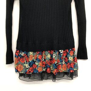 Half button up style shirt with a built in cardigan. The shirt portion is red multicolor floral and the cardigan portion is black.