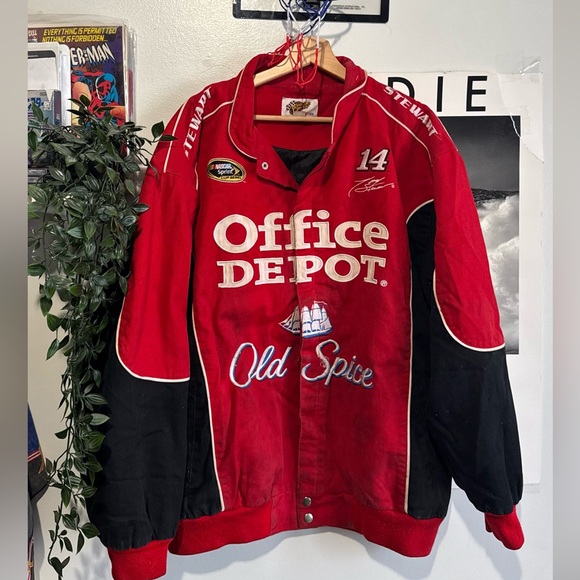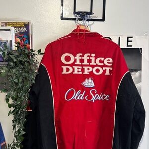 Red racing jacket with Office Depot and Old Spice logos. Features black and white accents.