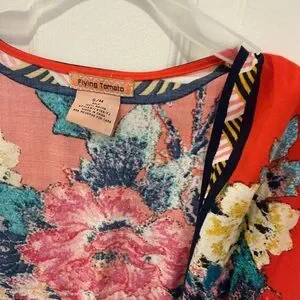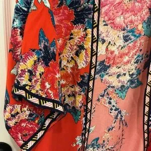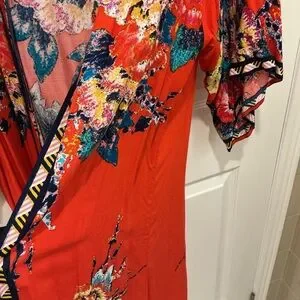 Open-front kimono with large floral print. Vibrant red base. Lightweight and flowy for easy layering. Size s/m, pit to pit 20”