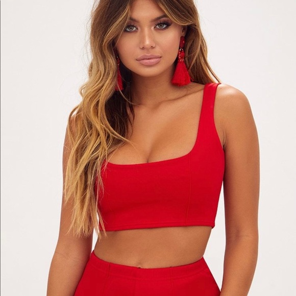 This red crop top has a satin feel to it - fits smaller chests better - size medium but a better small fit