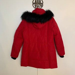 Bright Red parka! Soft cozy black faux fur lining. Brand new, never worn. Mid-length (hits the middle of thigh) Super warm in snow and rain. Pockets on the sides and upper arms. Double-lined with two zippers for extra warmth and flexibility. Thumbhole in the inner lining to keep hands warm and jacket down while wearing gloves. Very cozy and comfortable.