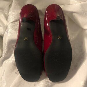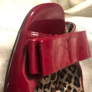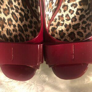 A Great Formal Slip On Pump Peep Toe Red Patent with a cheeky leopard inner pattern and cute bow.
