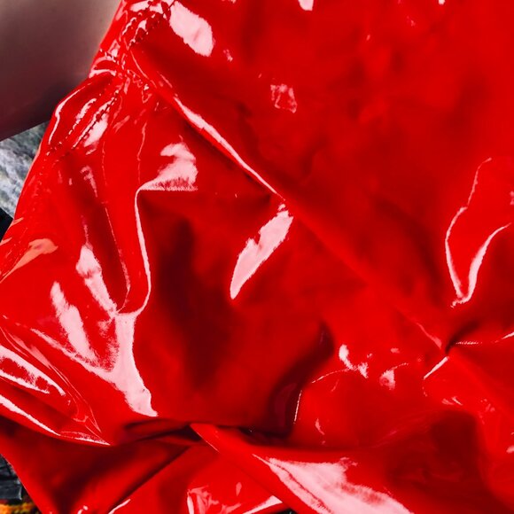 Eye-catching red patent vinyl mini dress, perfect for Halloween costumes or cosplay looks (devil, superhero, nurse, or club outfit).