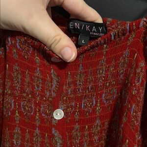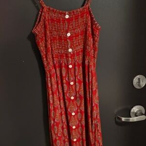Elegant red dress with a stylish button-down front. Perfect for any occasion. Has pockets and the buttons are fake